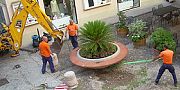 A sette giorni esatti dal primo fallito tentativo, questa mattina un escavatore ha provveduto allo spostamento della grossa aiuola per far spazio, con tutta probabilità, a sedie e tavolini