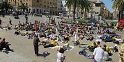 I manifestanti si sono riuniti in Piazza Vittorio Emanuele, manifestando per terra nei tre minuti sanciti dalle sirene