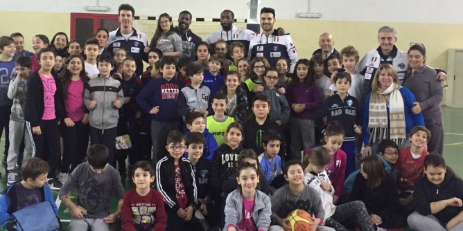 SANT'ORSOLA - L'esperienza dei giganti per i bambini della scuola elementare di Sant'Orsola, che sperimentano la gestione dei conflitti con il progetto "Il giudice alla rovescia", l'iniziativa proposta alle scuole del territorio dal Gruppo giuridico Norberto Bobbio. Questa mattina con coach Calvani, capitan Jack Devecchi, Brian Sacchetti, Christian Eyenga, Tony Mitchell e, arbitro d'eccezione, il presidente Stefano Sardara, un grande e festoso momento di sport e condivisione.