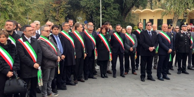 Nella foto: un momento dell'alzabandiera in Piazza Porta Terra alla presenza dei sindaci delle Città dell'Olio