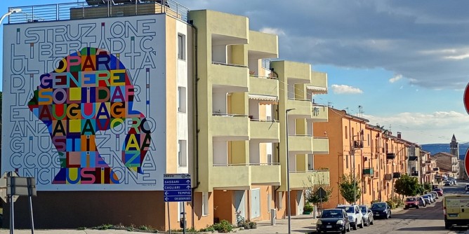 Il grande quadrato della parete bianca degli alloggi a canone sostenibile, situati in ingresso in paese dalla strada per Osilo, viene attraversato da una serie di parole che individuano, al centro, una silhouette con il profilo di una ragazzina, che si riempie all’improvviso dei colori e degli abbinamenti più vivaci. Il concetto è chiaro: parole come “giustizia”, “parità di genere”, “lavoro”, “uguaglianza”, ed altre, trovano il loro reale significato quando sono rivolte ai giovani che, come la ragazza del dipinto, volgono il viso verso l’alto, a osservare il mondo dagli adulti. Significativamente, la prima parola a comparire, in alto, e a fare da guida alle altre, è “Istruzione”.