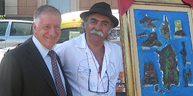 ALGHERO - Un'opera dell'artista algherese Tonino Alfonso raffigurante la Sardegna e la Corsica unite dal nuraghe e dalle isole sanguinaire, simbolo di Ajaccio, con un guerriero nuragico in primo piano è stata consegnata al Sindaco della cittadina corsa, Simon Renucci e al presidente Farina del circolo dei sardi "Su nuraghe" residenti in Corsica.