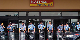 Nella foto: i militari presidiano l'ingresso dell'aerostazione.