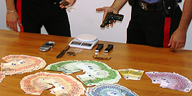 Il comportamento ha destato sospetto e, sottoposto a controllo, gli è stata rinvenuta indosso una pistola con la matricola abrasa. Attraverso una perquisizione estesa anche all'abitazione, quindi, gli operanti hanno trovato anche dell'hashish (oltre 50 grammi) ed il materiale per il suo confezionamento, oltre ad una somma in contanti di vario taglio per più di 33.000 euro, nonché due caricatori compatibili con la pistola (ovvero una Beretta calibro 7.65) che contenevano complessivamente 14 proiettili.