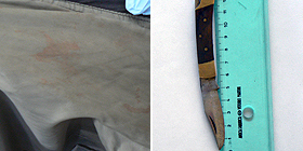 Nella foto: il coltello utilizzato dall'uomo per colpire il rivale e gli indumenti sporchi di sangue