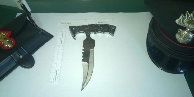 Sottoposto a perquisizione, l’uomo è stato trovato in possesso di un pugnale. Una volta portato in caserma per le formalità di rito, l'uomo ha dato in escandescenze, fino a minacciare i militari e provocare alcuni danni agli arredi della caserma.