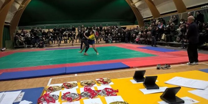 OLLOLAI - Successo al campionato nazionale di S'Istrumpa che si è disputato sabato scorso a Ollolai, all'interno di Impara s'arte, la tappa locale di Autunno in Barbagia. Piena in ogni ordine di posto la nuova palestra comunale che ha visto trionfare nella categoria dei massimi (oltre 81 kg) Edoardo Gigliotti di Nuoro che in finale ha avuto la meglio su Andrea Deiana di Elini. Terzo Salvatore Orgiu di Isili. Ma lo spettacolo è arrivato da tutte le categorie dove i gherradores hanno messo in mostra tecnica e grinta. Non da meno sono stati gli Juniores, figli della scuola de S'Istrumpa aperta dalla scorso anno dal nuovo corso della Federazione.